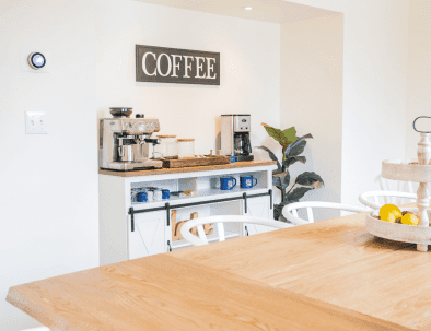 Breville self-grinding espresso maker on site with separate Breville drip coffee maker. Eat meals comfortably on our large 12-foot dinner table.