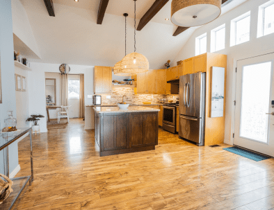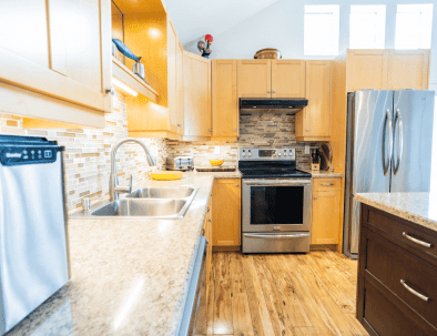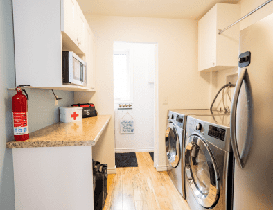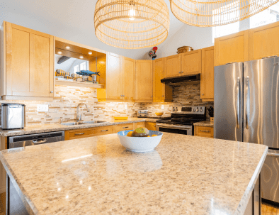 Fully stocked kitchen with stainless steel appliances, induction electric stove, large kitchen island, flat wear, Pots & Pans, and more!