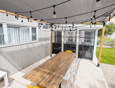Upscale firepit with built-in smoke reduction to create a smoke "less" experience. Dine outside on the 12 foot long table and under twinkle lights at night.