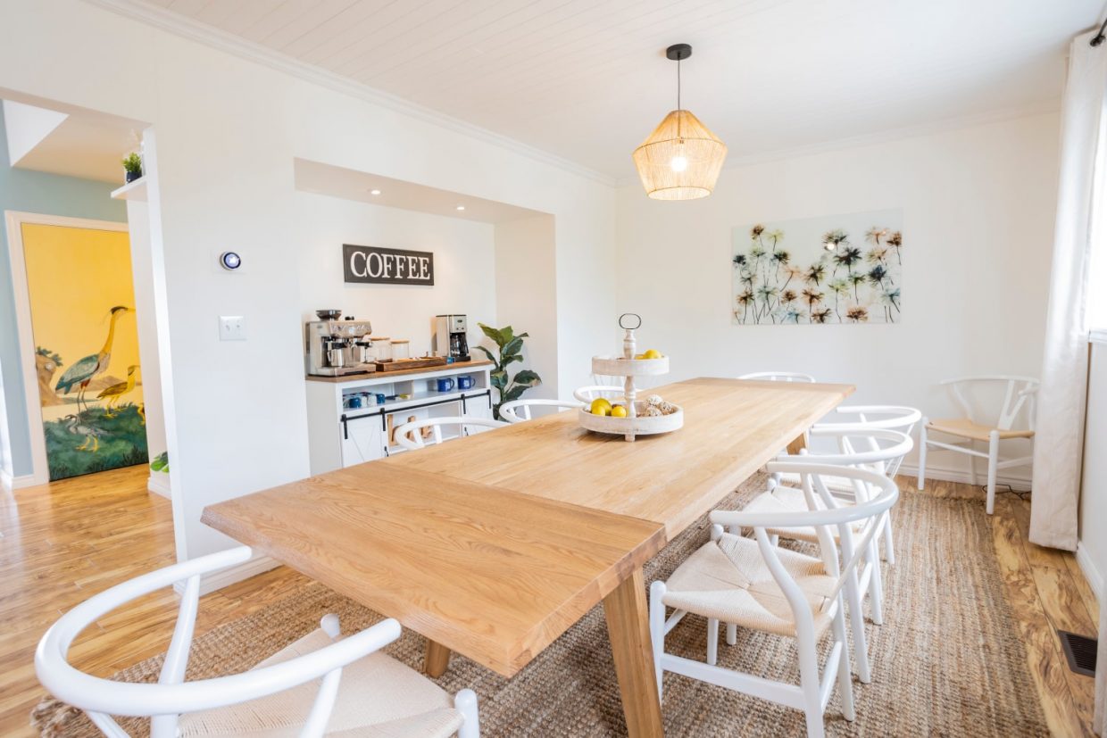 Breville self-grinding espresso maker on site with separate Breville drip coffee maker. Eat meals comfortably on our large 12-foot dinner table.