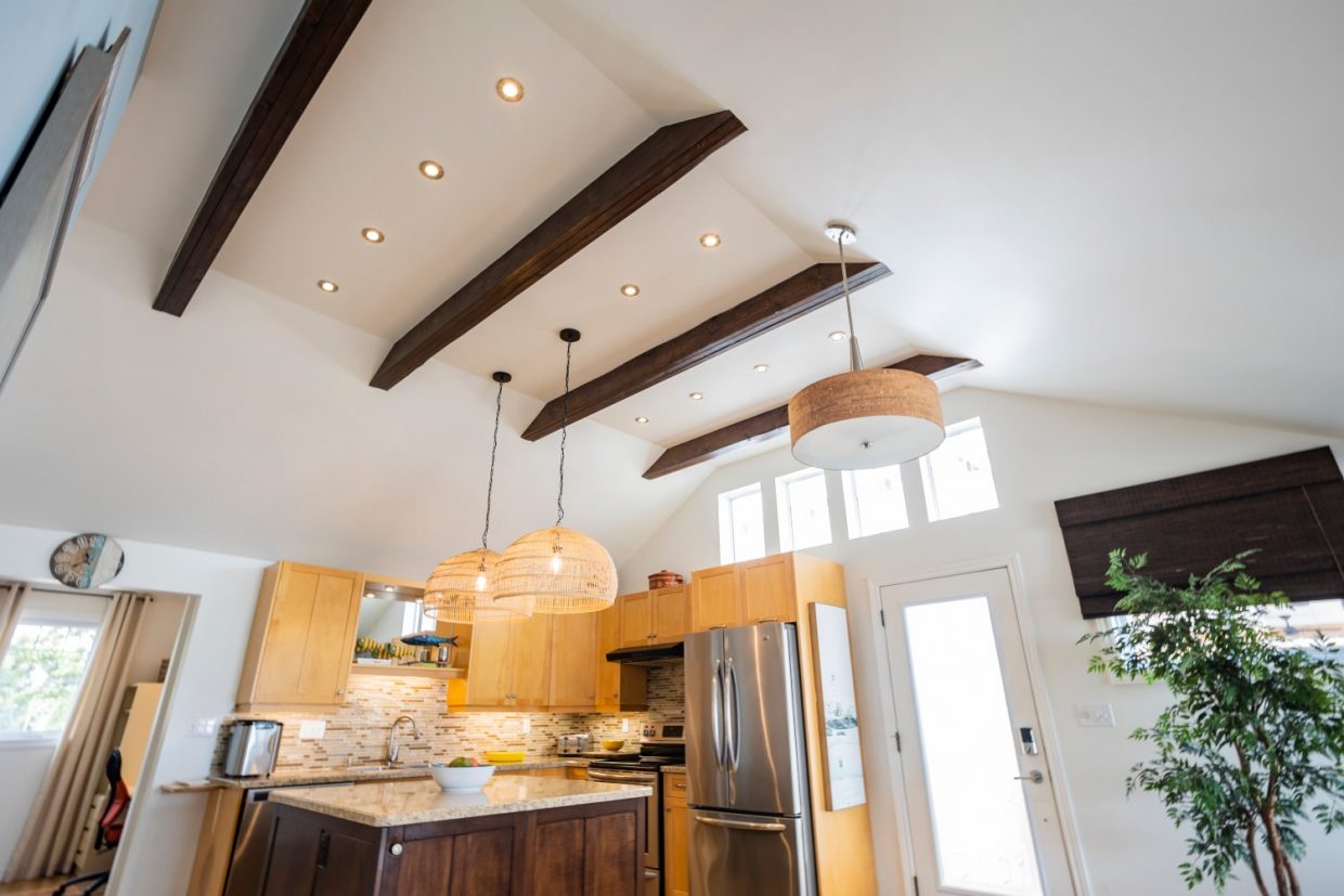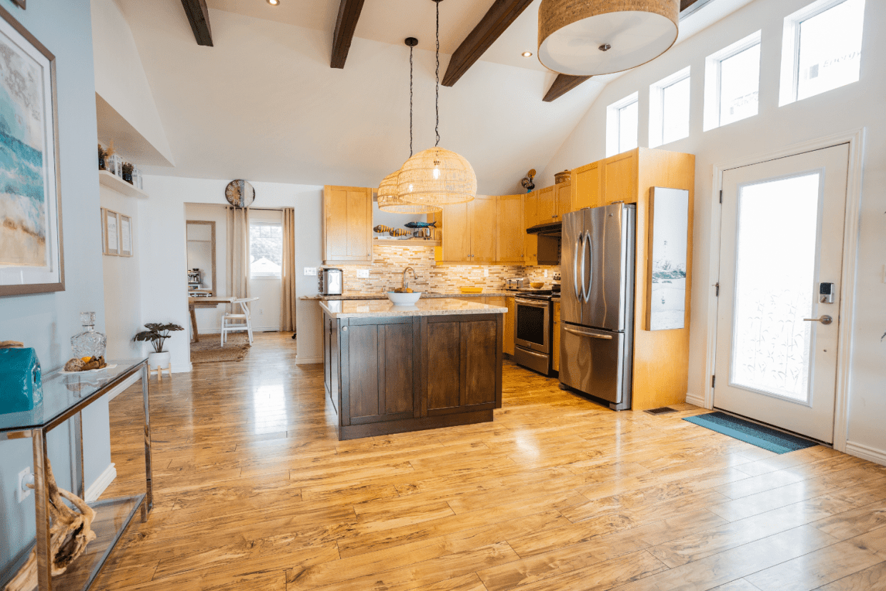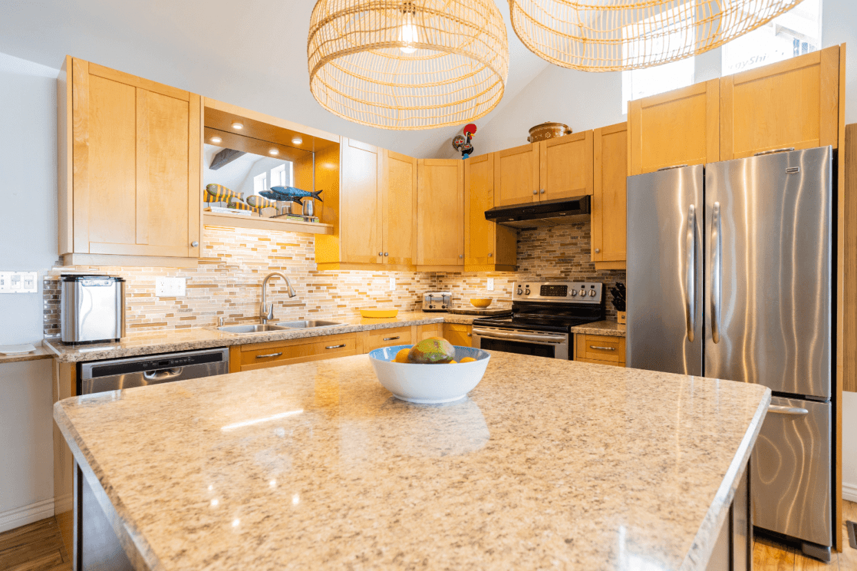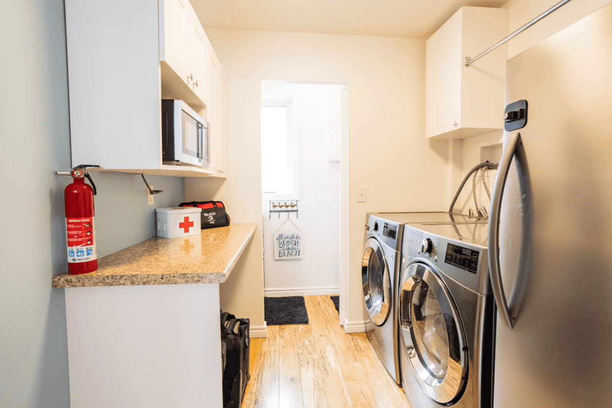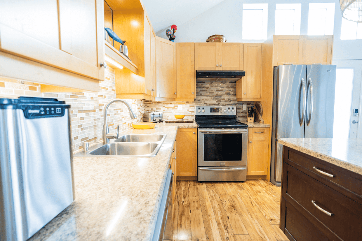 Fully stocked kitchen with stainless steel appliances, induction electric stove, large kitchen island, flat wear, Pots & Pans, and more!